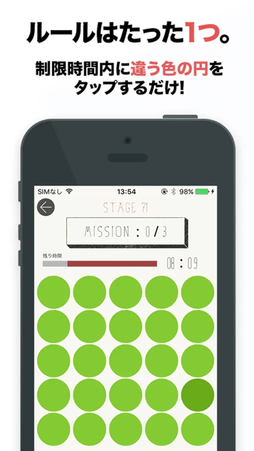 ・制限時間内に違う色の円をタップするだけのシンプルな間違い探しアプリです。