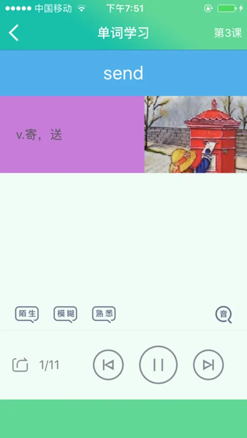 【单词学习】单词真人发声,单词类型、解释、图文例句等;点读功能,可单个单词反复朗读,强化记忆;可记录为陌生、模糊、熟悉状态的单词;多种在线词典查询,供联网时深入学习。
