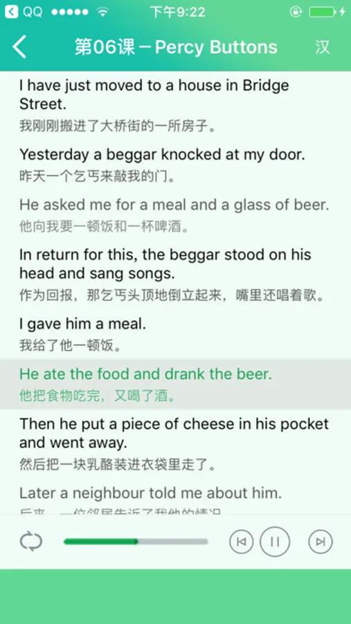 【课文同步】中英译文,有声同步,也可只显示英文;可单句循环,可顺序朗读往复循环,方便你自己控制,反复跟读和背诵。