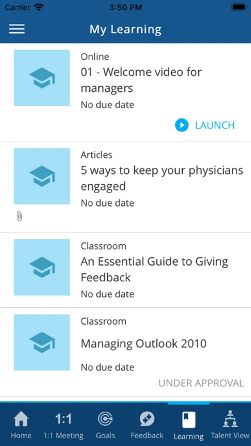 The Saba TalentSpace mobile app provides an extension of our Feedback, 1:1 Meeting, Learning and Talent View capabilities available in Saba TalentSpace. This free app gives end users an easy way to send and receive feedback, get tips and reminders on providing effective feedback, encourage and track 1:1 dialogue, access learning, work with goals, and connect with colleagues across the organization – all from a smartphone!