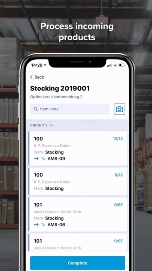 Incoming products can immediately be processed with App4picking. Assign a location to the incoming product with the app. The products and their location can be found directly in your ERP system.