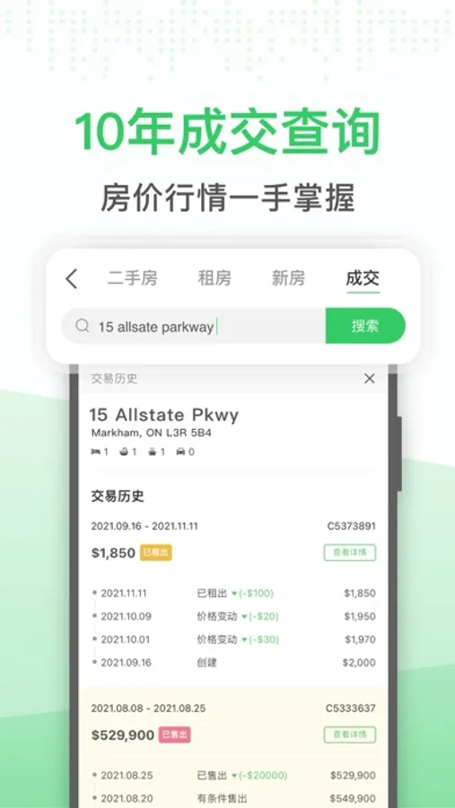 - 输入地址,即刻查询目标房源的挂牌历史与成交价格 ;