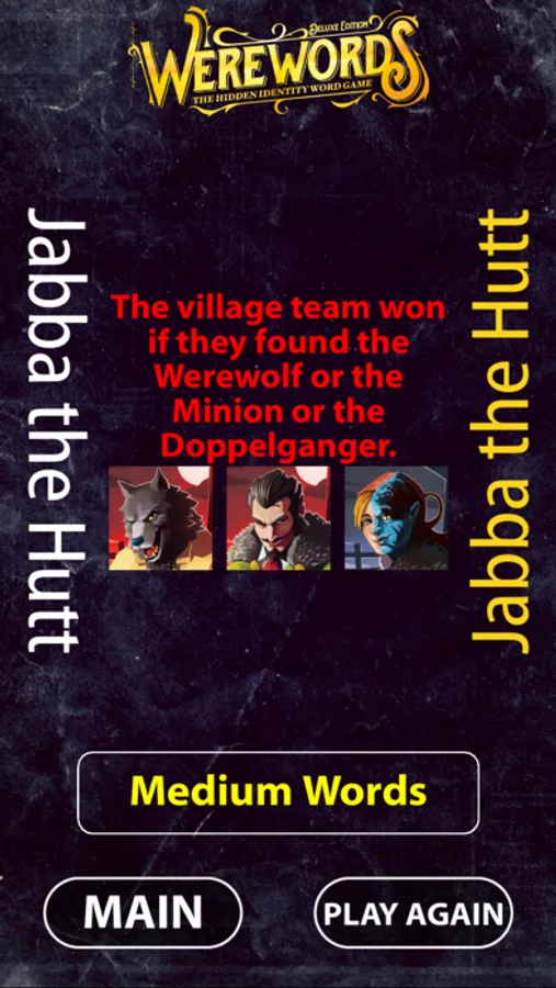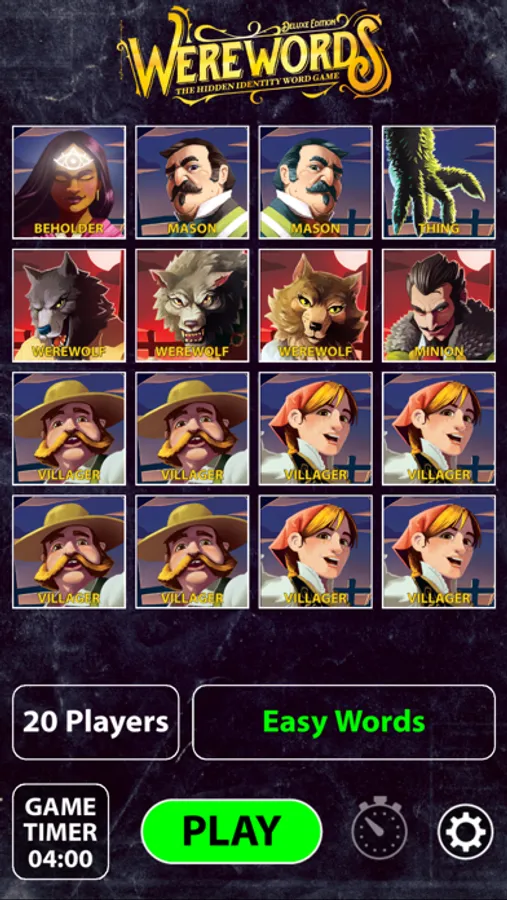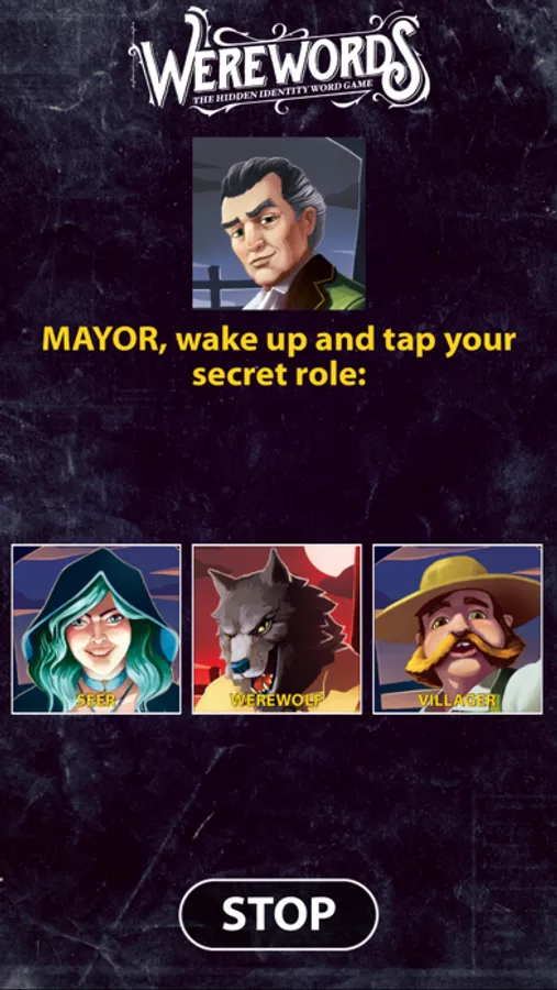 Choose the roles you are using in the game, then tap the Play button to start the game. The app will ask all of the players to close their eyes, then wake up the Mayor and any other selected roles in order. Then the app will ask all player to open their eyes, and the day timer will start. If the players guess the Magic Word before time is up, the Mayor taps the "Correct" button, and then the Werewolves can still win if they figure out who the Seer is. If the players do NOT get the Magic word before time is up (or if they run out of Yes/No tokens), the players can still win by figuring out who one of the werewolves is.
