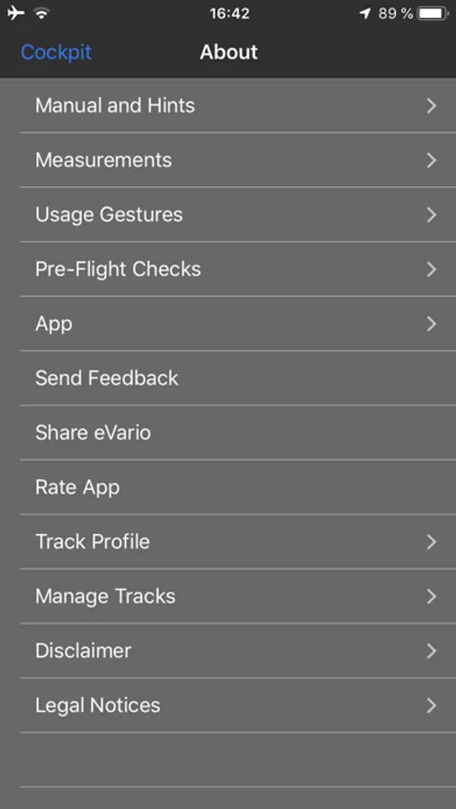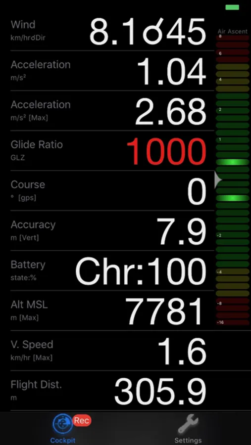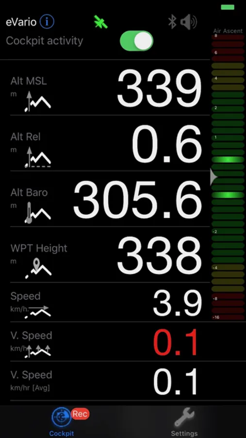 eVario is a 9-axis measurement (accelerometer, gyrometer, gps), barometer assisted, connected and intuitive instrument with a polychrom display, exploiting the embedded device’s hardware and accurate sensoric, without need to connect external devices. It typically provides real time information of a variometer like altimeter, speedometer, odometer, chronometer, gyrometer, anemometer for every (air)craft pilot. Its configurable cockpit allows you to keep track of the most relevant to you. The integrated data logger automatically records your 3D location and provides the recorded track file to e.g. your iCloud Drive for track visualisation or flight metrics.