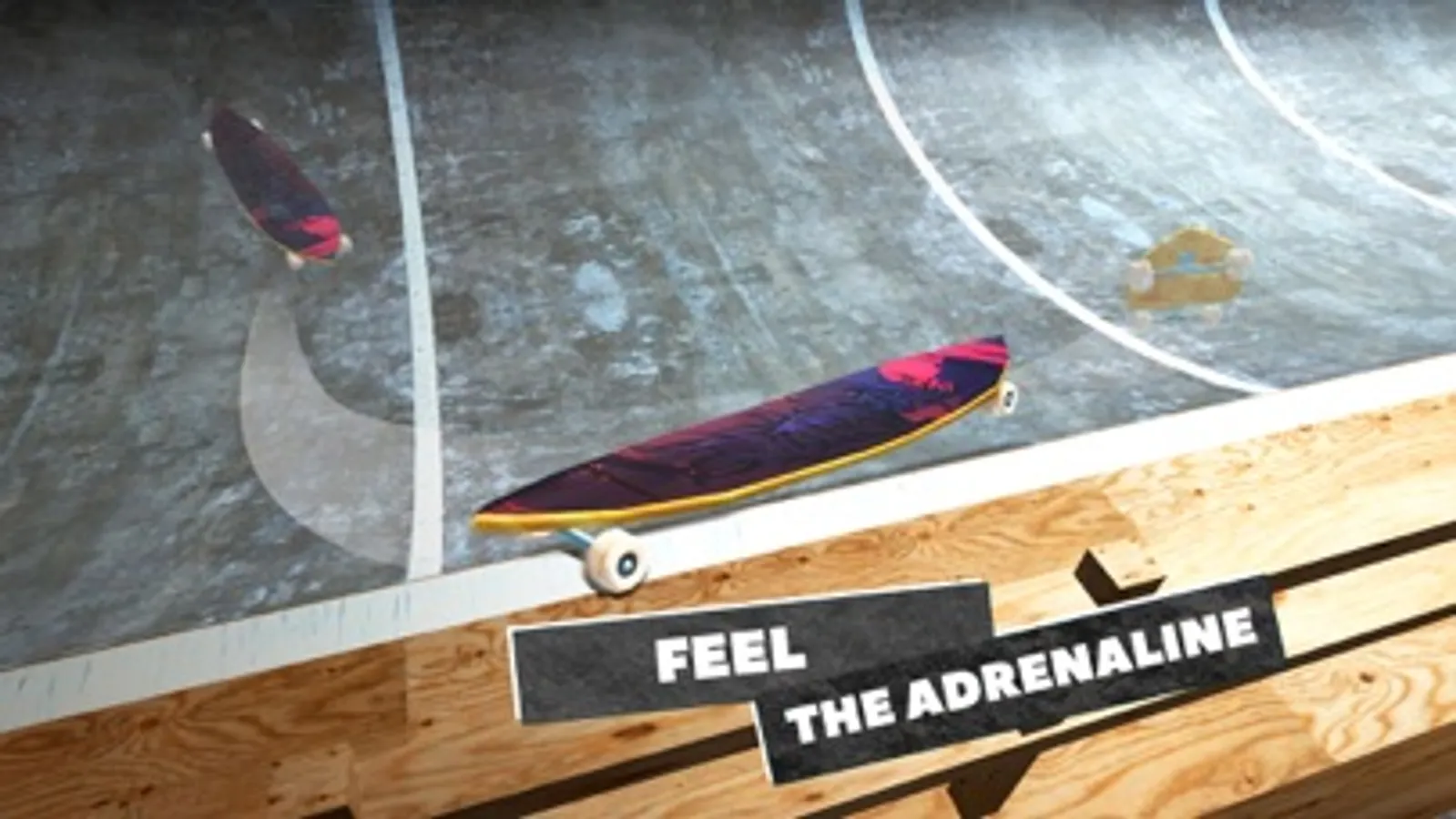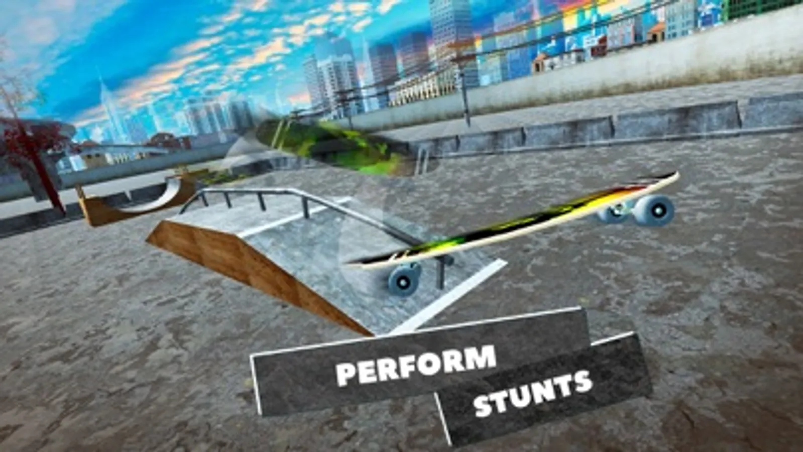 Get an authentic skateboarding experience in our skate park with its trampolines and obstacles! Just swipe your finger to perform tricks, stunts, and maneuvers - Ollie, Kickflip, Heelflip, Backside and Frontside Boardslide, Backside and Frontside Shove-it, 360 flip, Lipslide – you can perform all of this tricks!