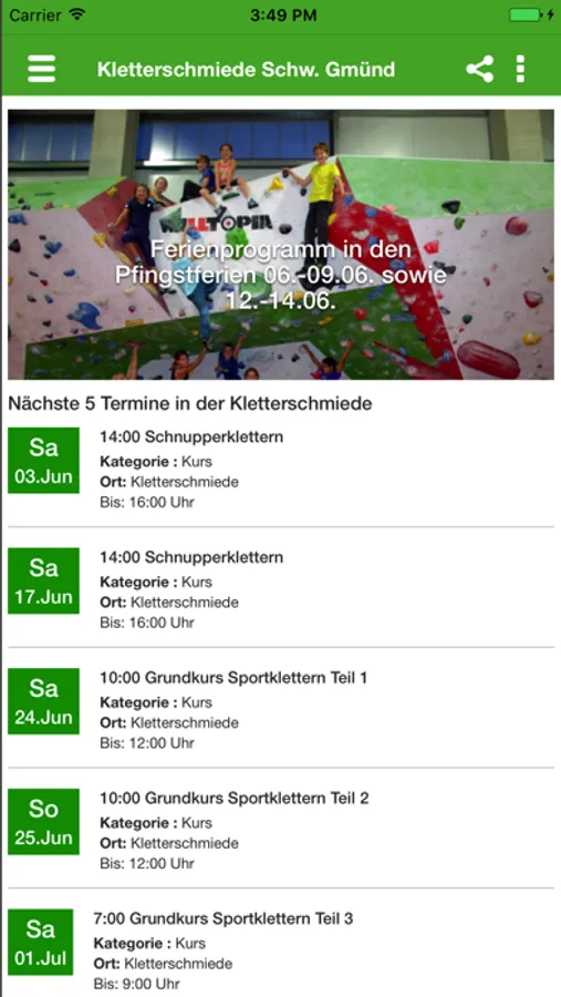 Mit der Kletterschmiede App wisst ihr immer, was in der Kletterschmiede in Schwäbisch Gmünd läuft. Aktuelle Termine, Berichte über Events oder den aktuellen Routenplan könnt ihr einsehen.