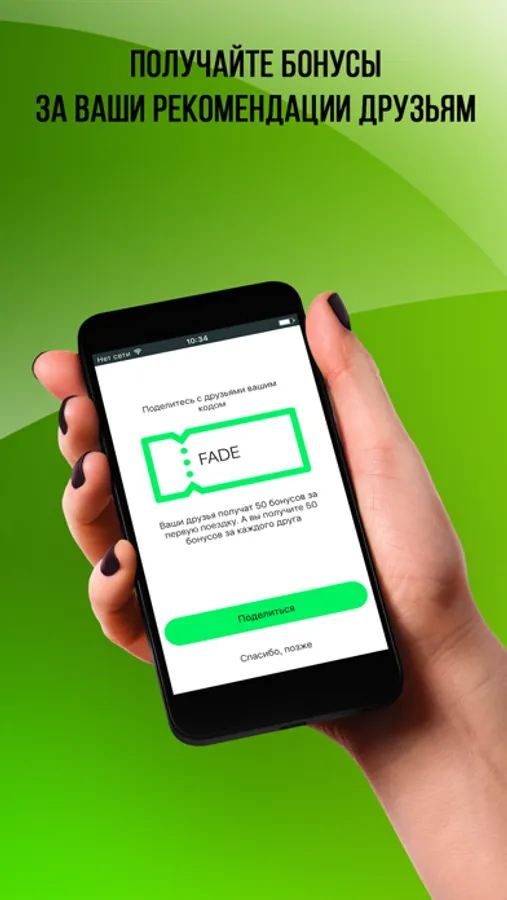 Вы можете ездить бесплатно или со скидками - расскажите друзьям о нашем приложении, поделитесь с ними вашим личным кодом: вы получите бонусные рубли за рекомендацию, а ваш друг - скидку на первую поездку.