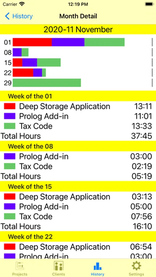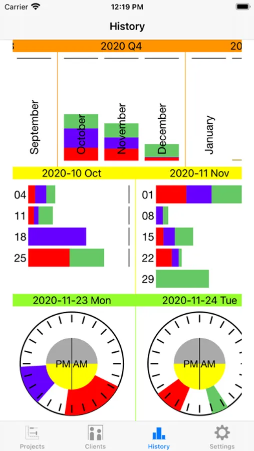 Project work history shows time spent on projects by quarter, month, week, and day.