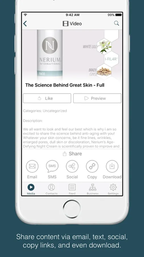 Media: It has never been easier to share information about your products and opportunity via SMS text, email, or social media. Simply choose tools specifically designed to promote your business and share them with a contact. You'll receive a notification when contacts view a tool so you know exactly when to follow up! No data connection? No problem! Simply download content in the app beforehand for offline playback.