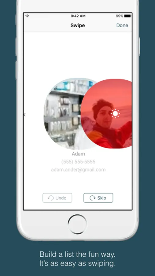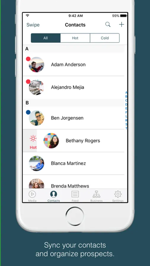 Contacts: Choose how to sync and manage your contacts. Swipe to sort them by interest level. You can make connections, add notes, or check out the Contact Feed to see the tools you've shared and contact actions.
