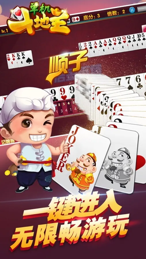 本游戏是一款浓厚中国特色的扑克游戏“斗地主”,简单有趣, 上手快!单机挑战,奖励,公平,舒心最火的免费游戏,智能ai如同真实的坐在牌桌上和网友一起欢乐斗地主,真实场景化的游戏界面,让您感受家一般的温馨。打斗地主就这么简单!