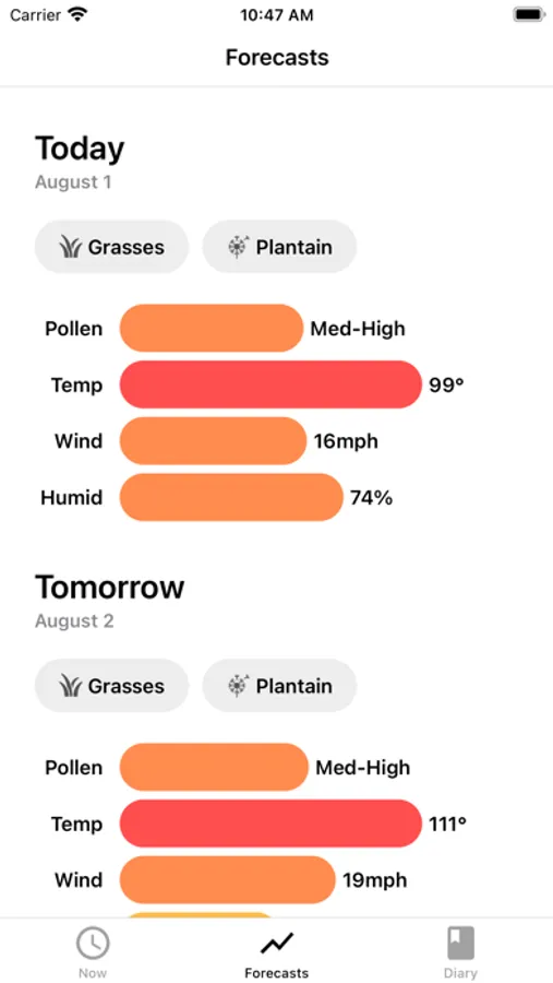 My Pollen Forecast is the best app for tracking the pollen count and your allergens. With a sleek modern design, you can view hayfever forecasts for the next 2 days and keep a diary of your symptoms. By using the app you will become more prepared for any allergy or asthma difficulties you could experience.