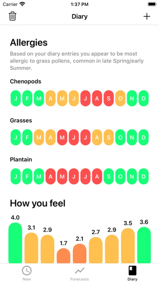 - Discover which pollens you are most allergic to by adding diary entries frequently.