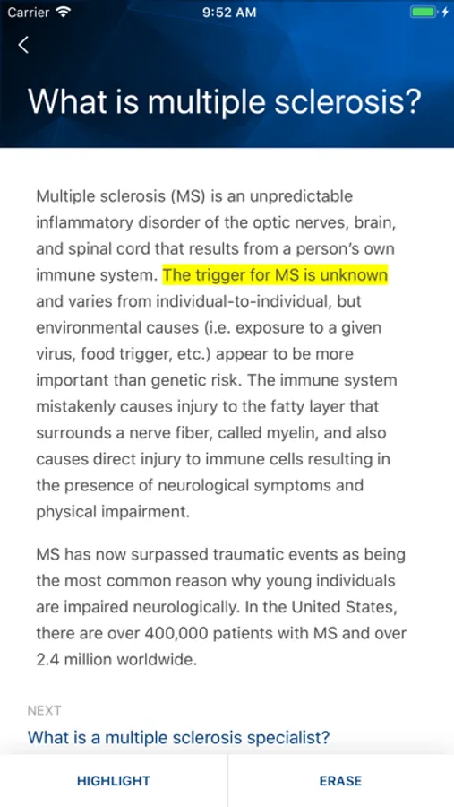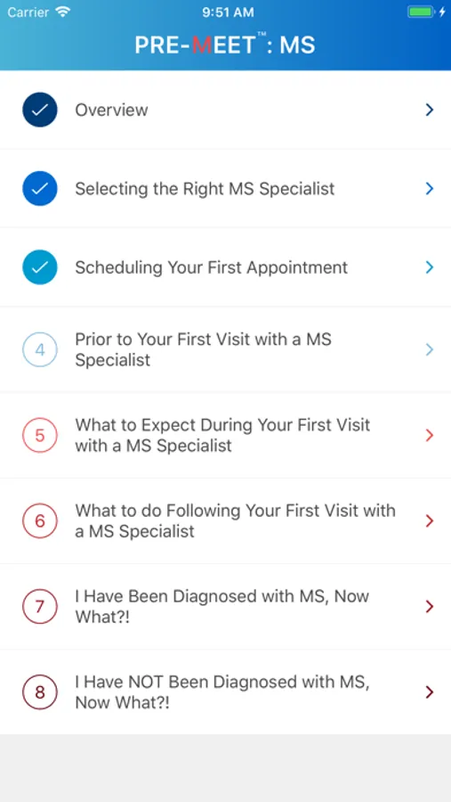Pre-Meet: Multiple Sclerosis is designed to help patients who have been referred to a multiple sclerosis specialist by helping them prepare before their appointment, know what to expect during their examination, and learn crucial next steps to follow depending on the outcome of the appointment. Within the U.S., over 250,000 new patients visits occur annually for multiple sclerosis. Furthermore, multiple sclerosis has surpassed traumatic events (i.e. motor vehicle accidents) as the number one reason why young individuals throughout the world are disabled. Approximately 400,000-450,000 Americans and greater than 2.5 million people worldwide have multiple sclerosis and frequently these patients seek opinions from new healthcare providers. Multiple sclerosis is an extremely complex and enigmatic chronic disease with no cure. Therefore, one can imagine how nerve wracking and daunting a simple referral is to a multiple sclerosis specialist, even before a diagnosis has been made. This app helps calm the many patients who are referred to a MS specialist who feel anxious and scared before their appointment. Furthermore, the app provides valuable insights into each step of the neurological examination and outlines key next steps to take after the appointment, including a general overview of multiple sclerosis and MS relapses. Ultimately, this app helps patients feel more in-control of their health appointment. The app also provides guidance for those who may not be diagnosed with multiple sclerosis after the initial consultation.