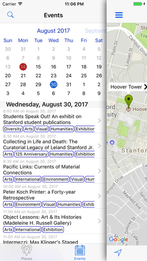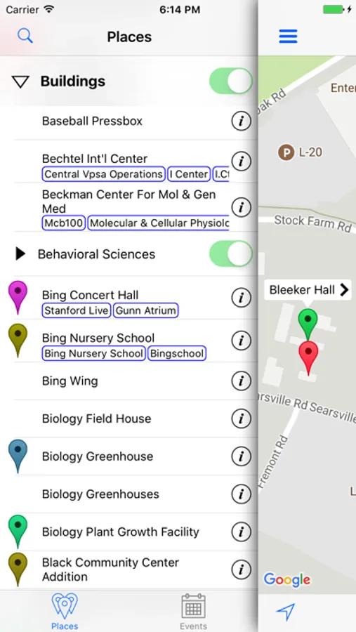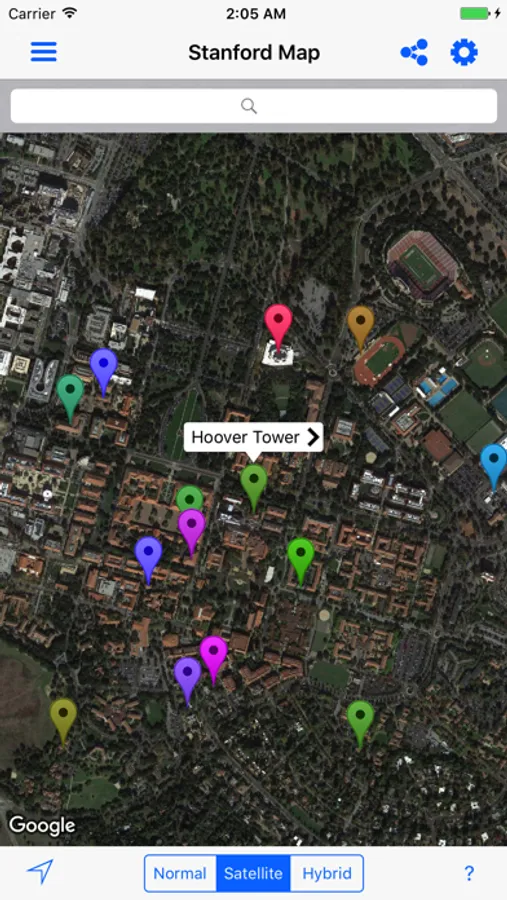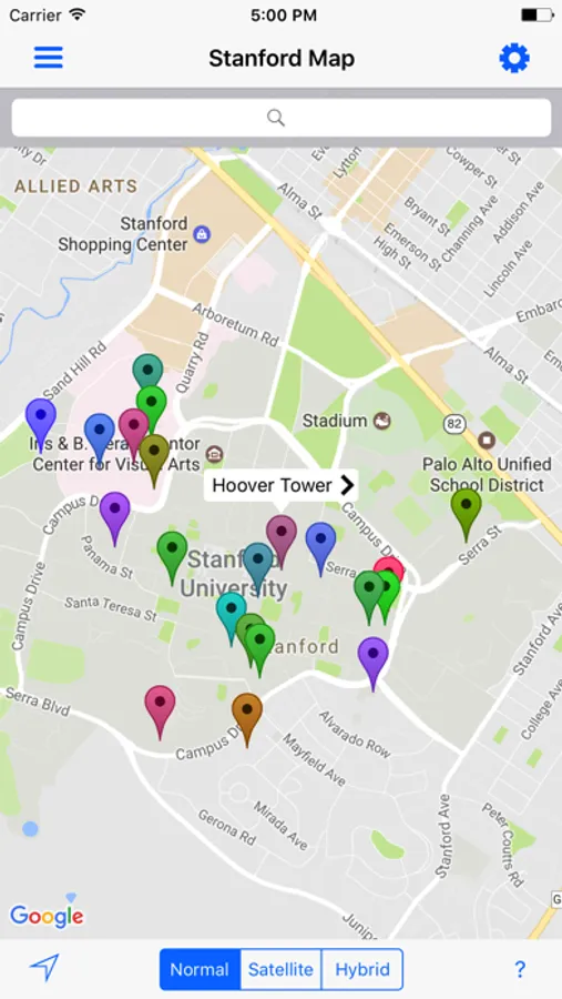 Stanford Map gives you easy access to places and events information in the town of Palo Alto, CA and the campus of Stanford. Use the legend on the left to browse or search for locations and plot them on the map. Tap on the marker's callout to take you to the detail screen from which you can get directions to the plotted point, or view the POI's website (only available for some locations).