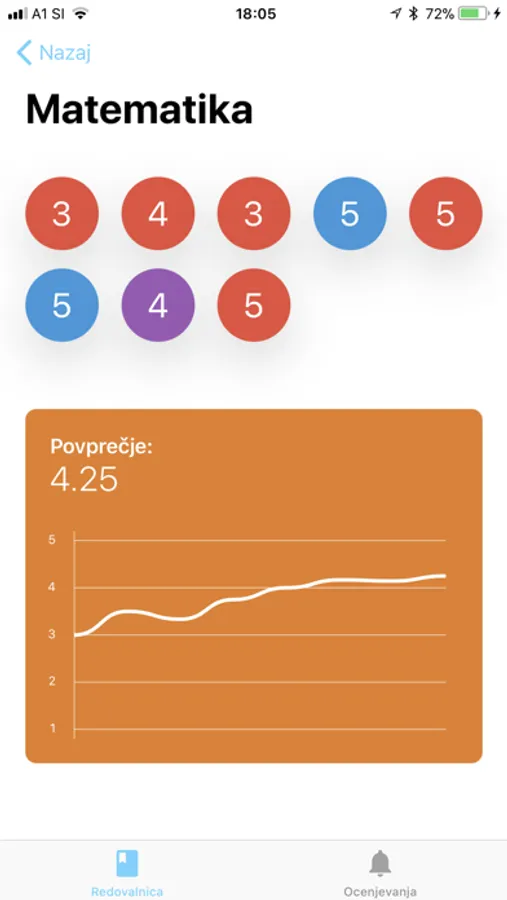 Vaše ocene so shranjene v elektronski redovalnici, ki je lahko zavarovana z geslom. Za vsak predmet vam v podamo povprečje in izrišemo graf za boljšo predstavo.