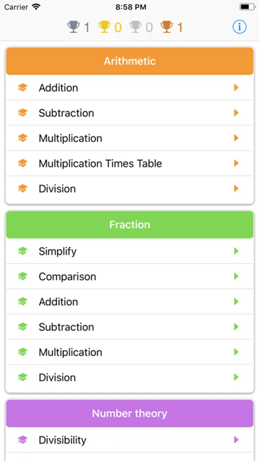 The app contains the following subjects: Early math, Arithmetic, Fraction, Number theory, Decimal and Trigonometry.