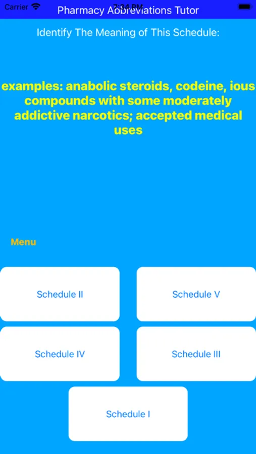 The app is a helpful study aid for those studying to become pharmacy technicians, nurses, doctors and even patients of the general public interested in understanding what their doctor has prescribed for them. Quizzing of the descriptions of Schedule class numbers for restricted prescription drugs is included as well.
