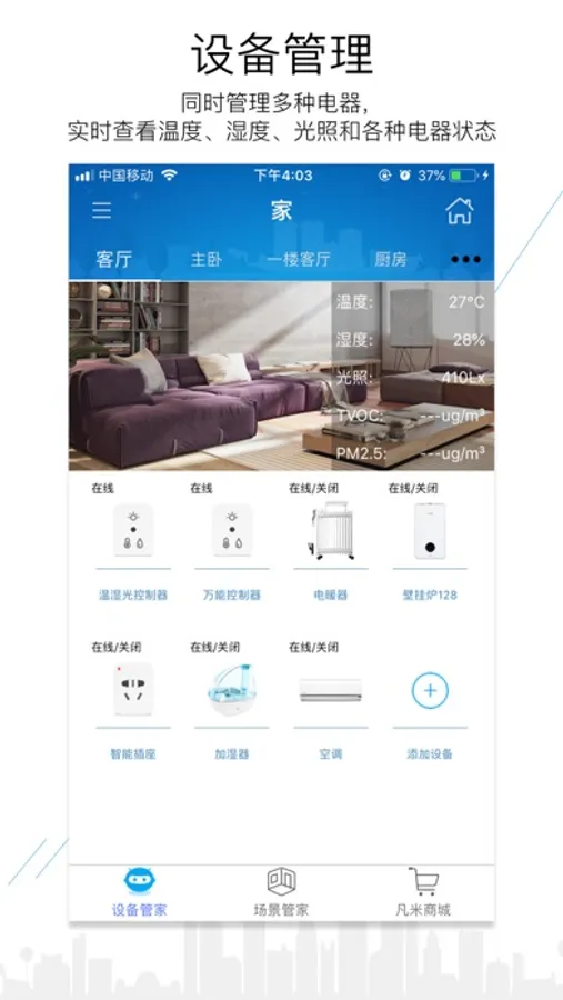 凡米智家APP可支持FamiSmart系列产品的接入以及控制管理,也可以根据用户设置通过产品之间的自动关联组合,将用户普通家电智能化,让用户以最小的代价、最快的时间实现智能家居的体验。