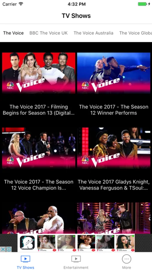 Reality TV Shows is develop to stream, play video from famous TV shows on youtube as America's Got Talent, Britain's Got Talent, The X Factor, The Voice, X Factor UK,....