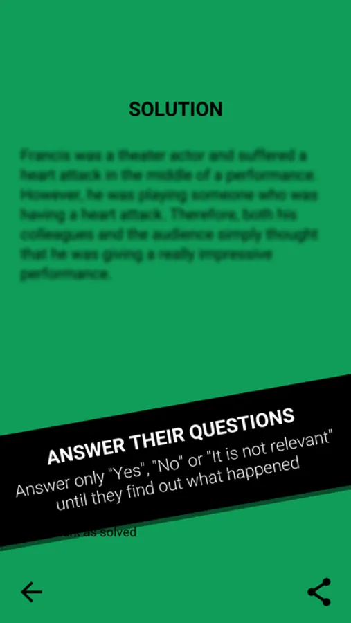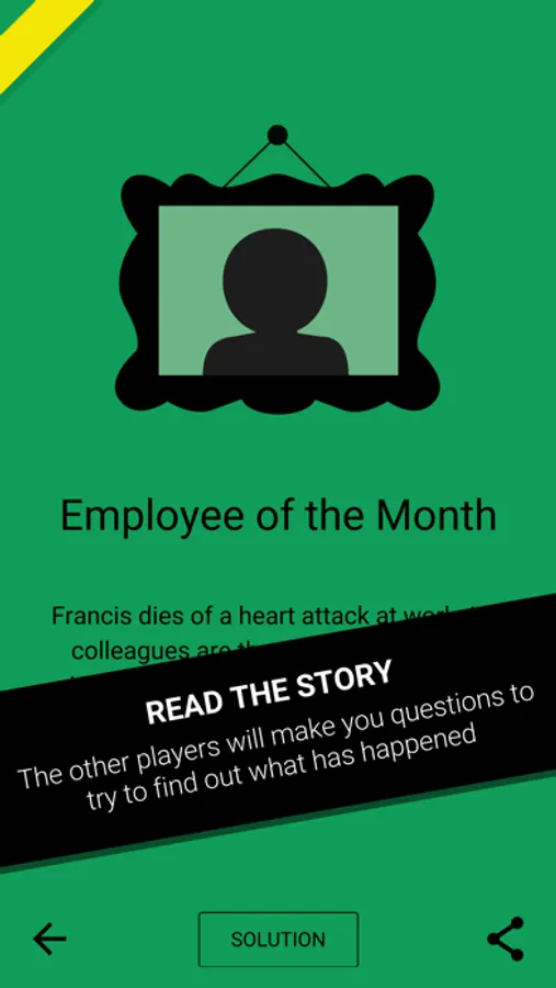 Then he/she reads its solution without telling the other people. The rest of the players then have to make questions in order to solve the mystery.
