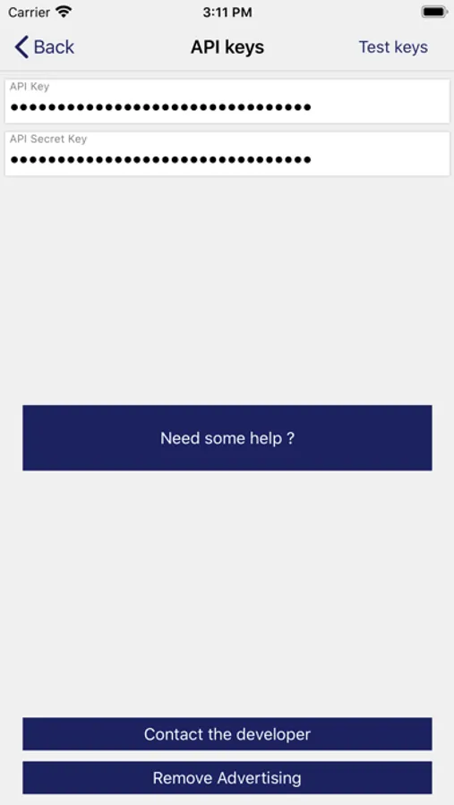 Just enter your API keys on the API keys screen once and they are stored very securely. After that, enjoy this useful application.