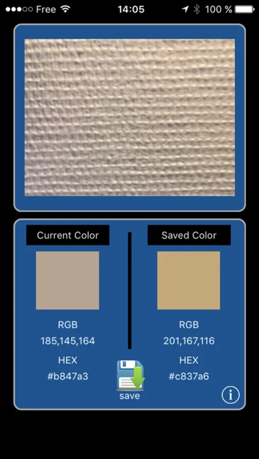 The color comparator is a tool that let you use your iDevice camera to detect a color and display the RGB and HEX value for this color.
