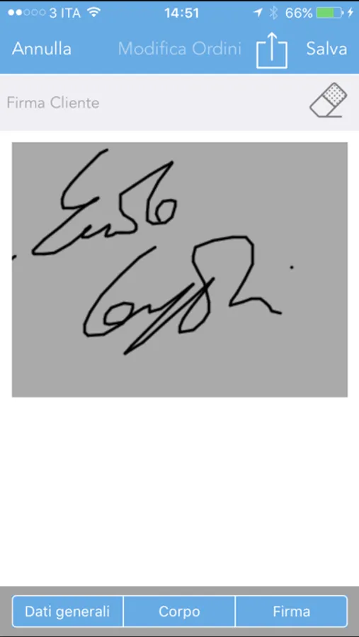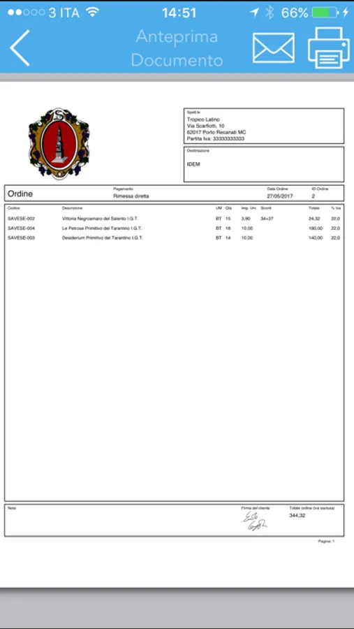 - Possibilità di generare il PDF dell'ordine firmato dal cliente e con all'interno il logo del fornitore;