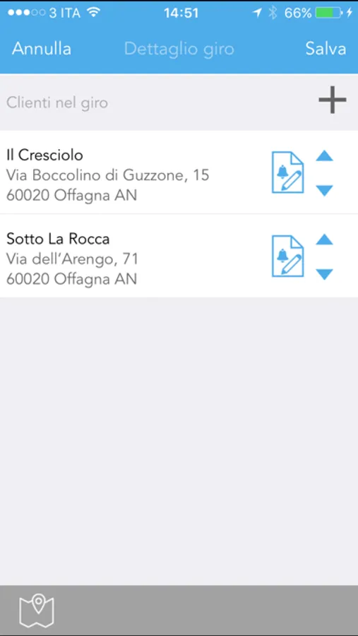 - Possibilità di pianificare i “giri-visite” presso i propri clienti elencando in ordine cronologico i clienti da “visitare” con possibilità di visualizzarli sulla mappa e di utilizzare la funzione navigatore di Mappe per raggiungere ogni cliente;