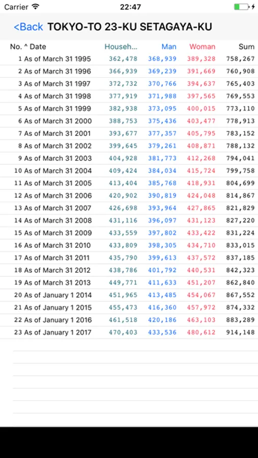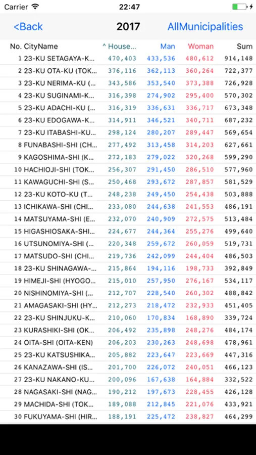 Software that displays the population of the municipality of Japan (man, woman), the number of households.