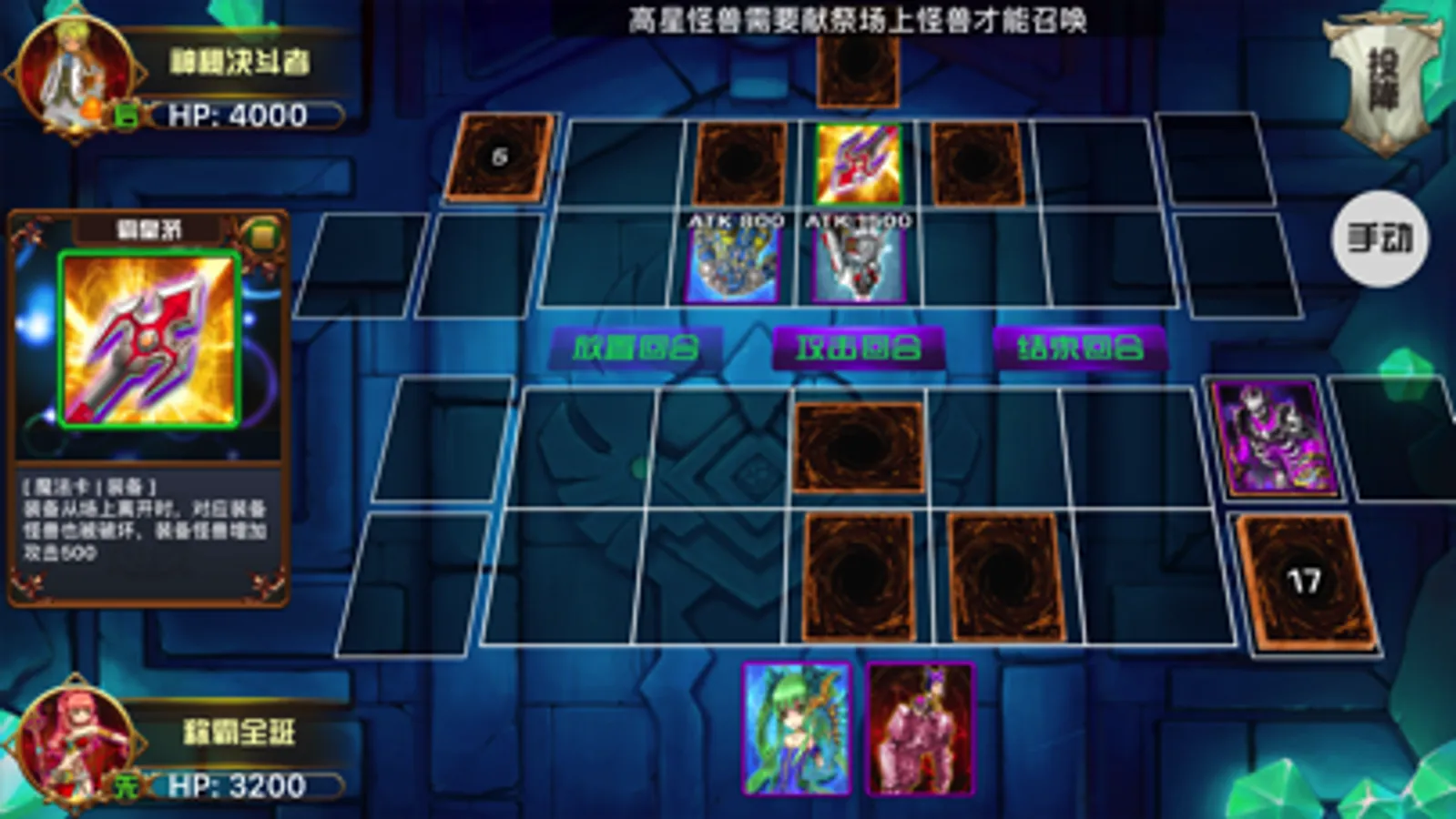 1、攻击表示的两只怪兽战斗,如果攻击相同,则全部死亡送去墓地,否则战斗低的一方死亡,并且对应玩家损失攻击差值的生命值