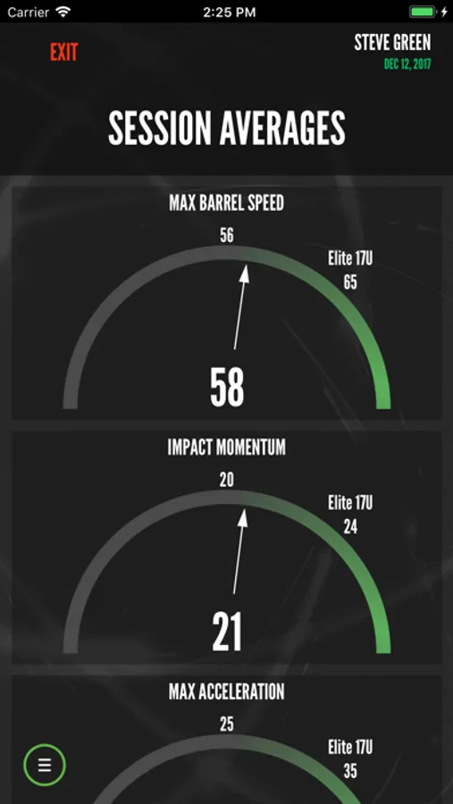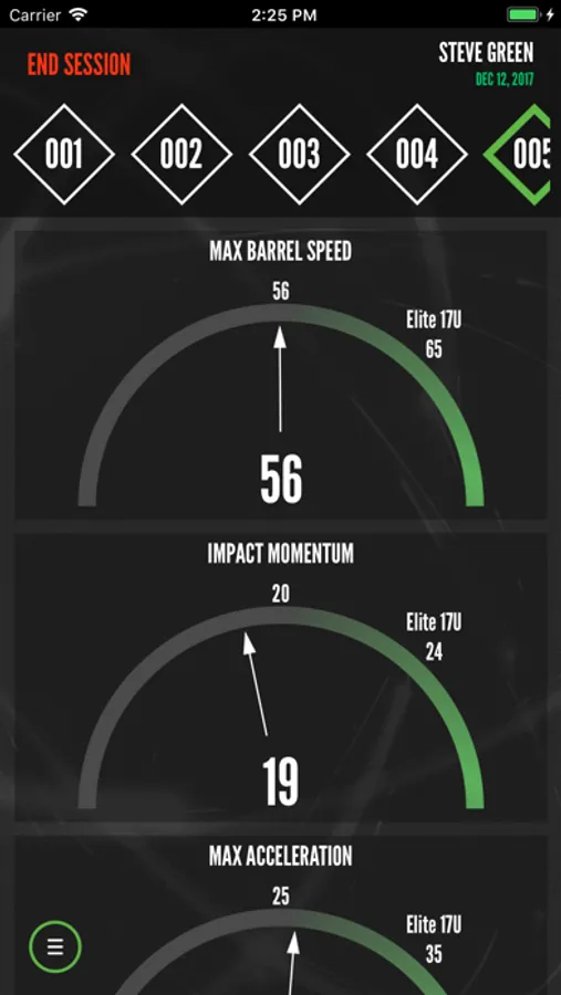 Session creation has been simplified to automatically populate a player’s profile with the three most common bat sizes as well as a generic load position from both the left and right side of the plate. The history page has been limited to a single view that shows only the 3 rankable showcase metrics (Max Barrel Speed, Max Acceleration, and Impact Momentum) with the option to view any of our three rangeable showcase metrics (Hand Speed, Trigger to Impact Time, Approach Angle).