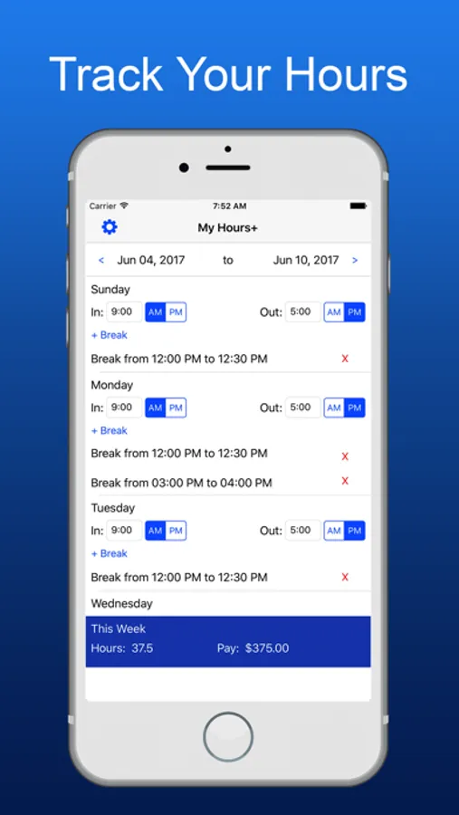 Hours+ is a simple time sheet app that keeps track of hours for that week.
