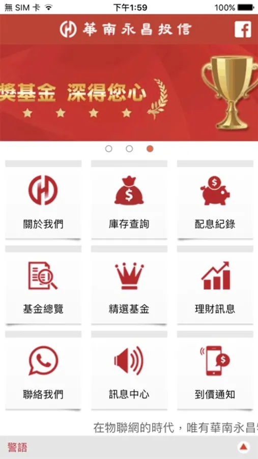 華南永昌基金APP提供最新全系列基金資訊服務,包括基金基本資料,淨值走勢、績效表現、配息資訊等;此外,華南永昌基金APP亦提供即時市場資訊、最新優惠及講座資訊,輕鬆掌握投資大小事。