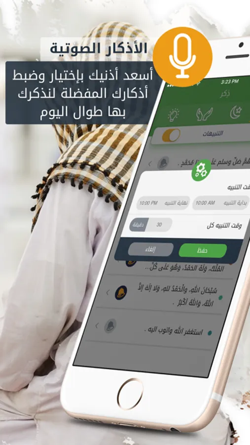 - اختر أذكارك المفضلة، و«ذكر» سيرسل لك إشعارًا صوتيًا على مدار اليوم ليذكرك بها.