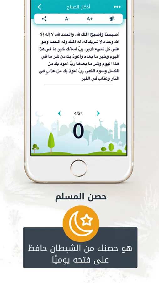 - كن في حصن من الشيطان، واستمتع بحصن المسلم في شكله الأنيق، وطريقة عرضه الممتعة لكل الأذكار التي تحتاجها.