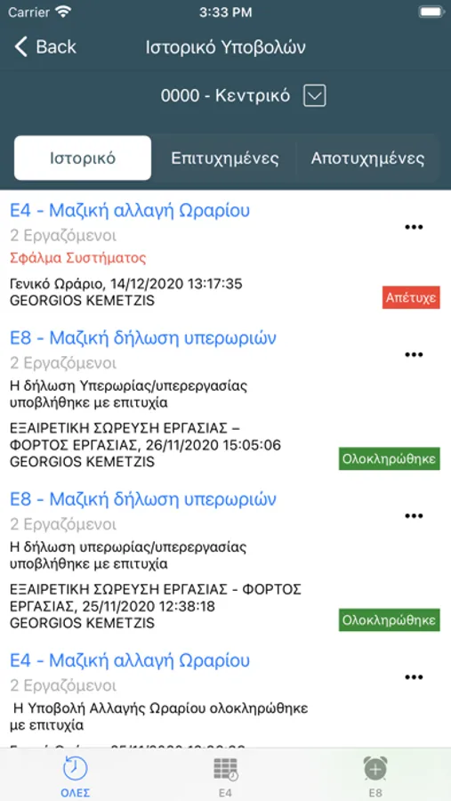 -- Προβολή ιστορικού και κατάστασης υποβολών Ε4 και Ε8 ανά εργαζόμενο και ανά υποκατάστημα