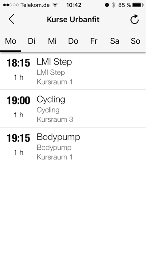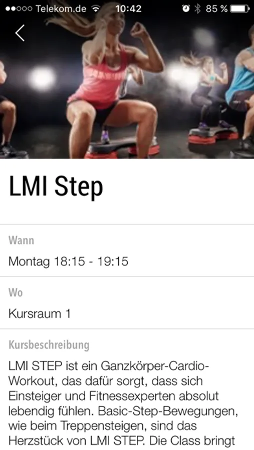 Direkter und aktueller Zugriff auf den Kursplan von überall: Für jeden Kurs kannst Du Details wie Zeit, Kursbeschreibung, Raum und Merkmale wie z.B. den Schwierigkeitsgrad einsehen.
