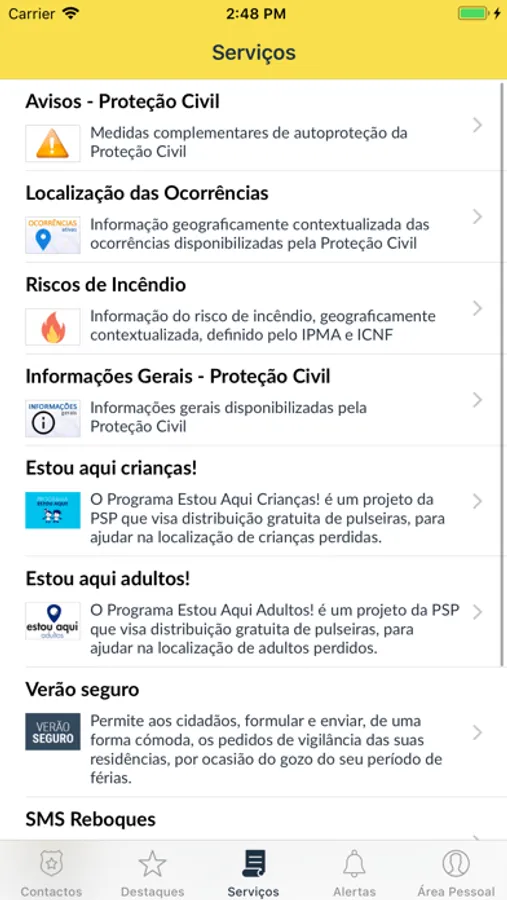 ● Programa Estou Aqui Adultos - A Polícia de Segurança Pública tem por missão constitucional e legal defender a legalidade democrática e garantir a segurança interna e os direitos dos cidadãos, garantindo designadamente as condições de segurança que permitam o exercício dos direitos e liberdades e o respeito pelas garantias dos cidadãos, bem como garantir a ordem e a tranquilidade públicas e a segurança e a proteção das pessoas e bens. No âmbito da sua missão e de acordo com a visão existente, a PSP identifica a necessidade de garantir a segurança de adultos que, pelas mais variadas razões, podem sofrer alguma desorientação na via pública, no sentido de colmatar essa vulnerabilidade. O programa Estou Aqui Adultos foi pensado para proteger e dar apoio a quaisquer adultos que possam vir a ser encontrados na via pública em estado de especial vulnerabilidade, permitindo a sua correta identificação e o contato célere com um familiar. O primeiro contato é muitas vezes crítico e a urgência com que a pessoa é identificada, pode fazer toda a diferença, sendo dever da Polícia procurar todas as alternativas para que esse processo seja rápido, simples e seguro.