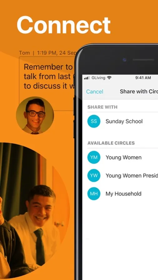 The Circles feature connects you with family, classes, quorums, and others who serve with you in the Church. You can have conversations about group activities, discuss what you are learning, share goal progress, and encourage and support one another. From the Discover feed, content can be shared such as inspirational articles, images, quotes, videos, and ideas for service and group activities. Within Circles, members can create group activities or meetings and invite others to events; participants can RSVP indicating participation."