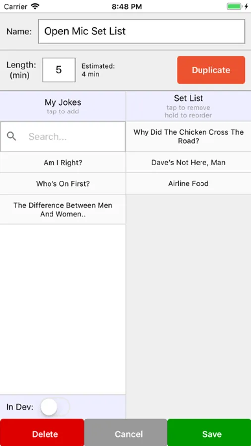 - Create set lists with ease, dragging and dropping jokes into place, and track or automatically calculate their estimated length