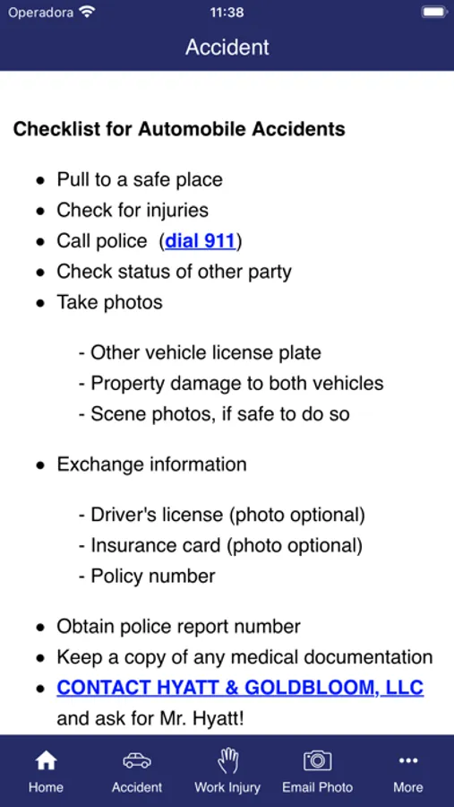 This app includes tools for use in auto accident or work place injury including sending details, photos and voice reports, directions to our office and receiving push notification messages.