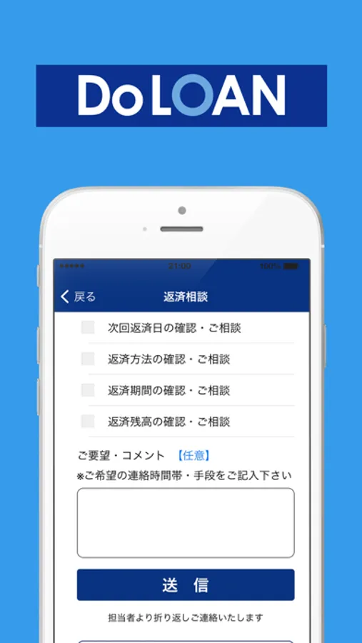 ご契約状況の確認、変更や、事務手続きに関するお問い合わせ、追加融資や不動産処分に関する相談などをアプリからお問合せいただけます。