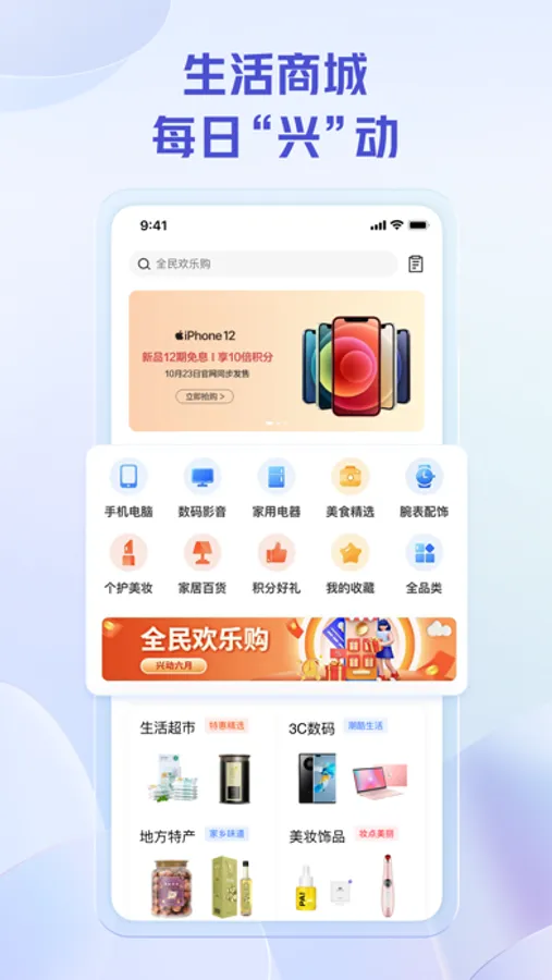 4、【生活商城 每日特惠】 提供海量优质知名品牌商品,衣食住行全方位覆盖,将“实惠、好用”贯彻到底,信用卡、借记卡、他行卡支付无障碍!