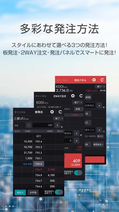 「2WAY注文」では、最短1タップでザラ場中の最良気配での注文発注が完了。「板発注」では、気配情報を確認しながら板上でタップすることで直接発注がおこなえ、取消や訂正もわずか2タップでストレスフリーなお取引を可能に。さらには、銘柄リスト、板、チャートのどの画面からでも発注でき、タイミングを逃すことなくシームレスな操作を可能にしています。