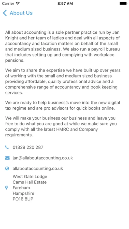 All about accounting is a sole partner practice run by Jan Knight and her team of ladies and deal with all aspects of accountancy and taxation matters on behalf of the small and medium sized business.