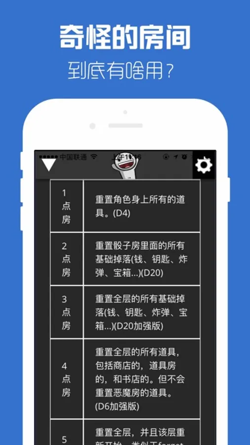 《以撒的结合》两个版本+DLC共计343中道具,本应用尽数收录,还收录了各种牺牲房间、隐藏房间、套装效果、骰子房间的玩法说明