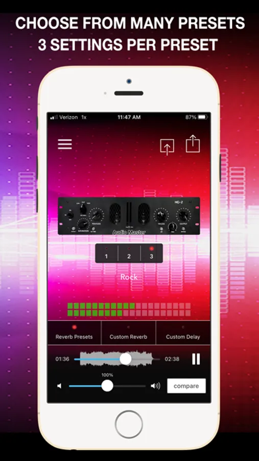 Choose between our fully adjustable 6 band EQ or presets of 3 settings per genre. Export, save and share anywhere. Audiobus, IAA and AUv3 compatible. If you'd like to try before you buy, check out AudioMaster (not Pro).