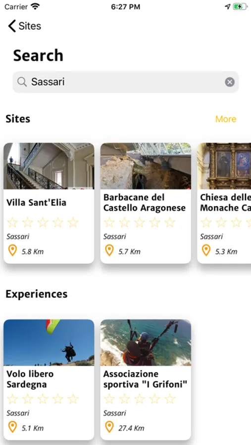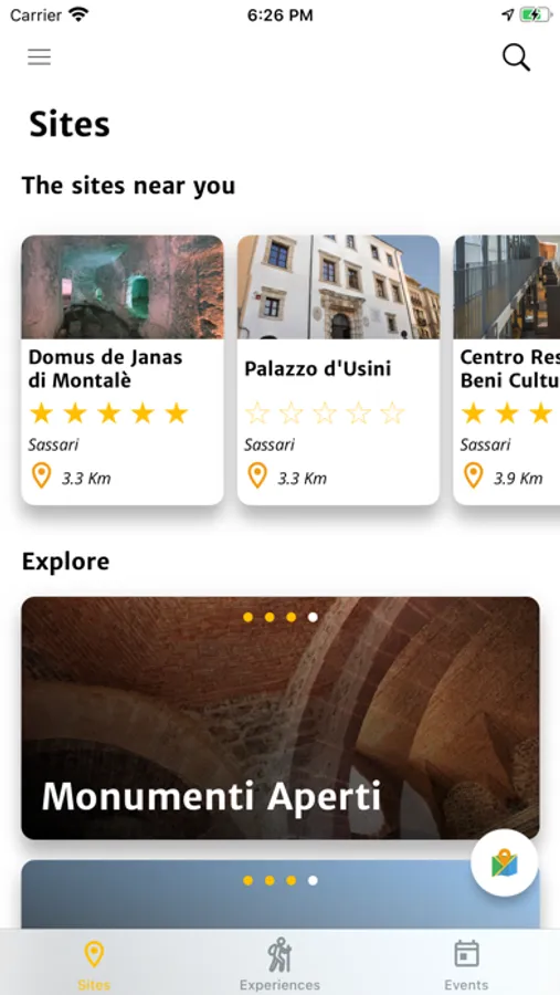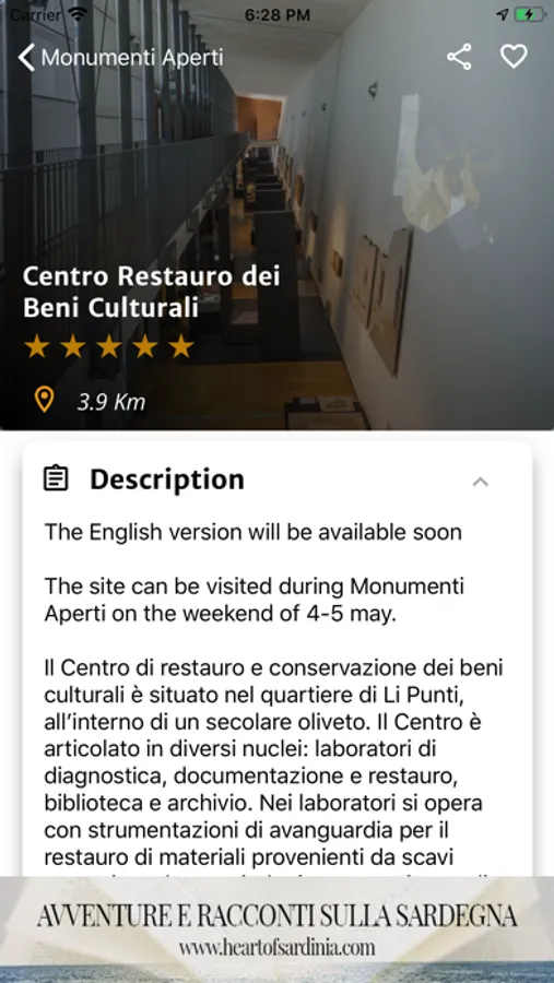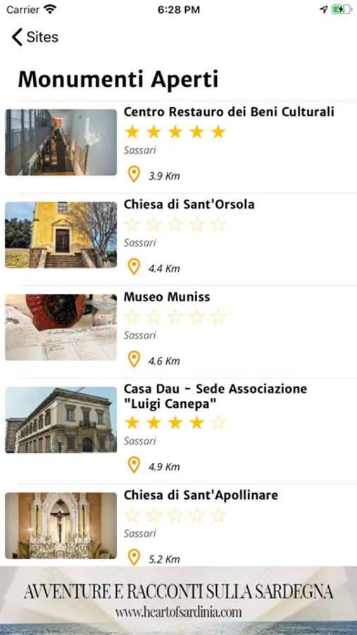 SITES: divided into Sea, History, Nature and Villages, all geolocated and sorted according to the distance from the user, they are accompanied by dedicated cards containing detailed descriptions, useful info and photos