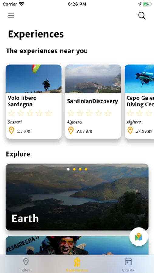 EXPERIENCES: divided into Earth, Air and Water, through geolocation you can find out what activities are present around you. Discover excursions, trips, sports and cultural activities nearby.